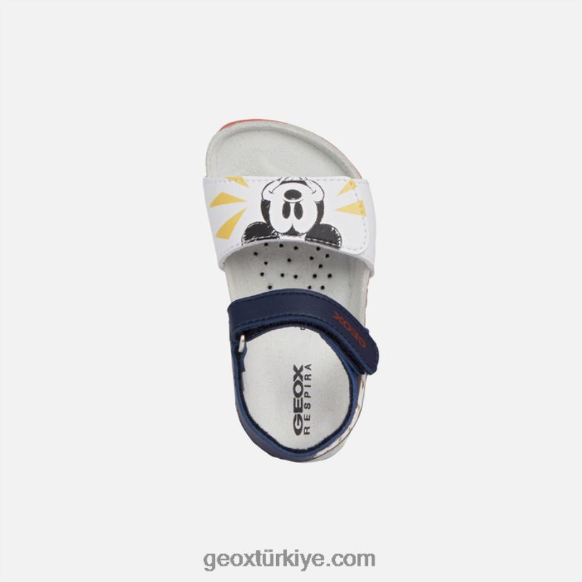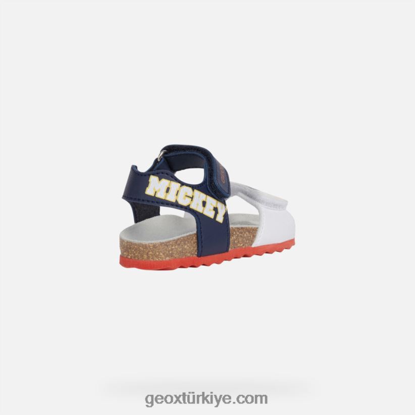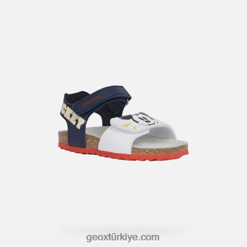 anatomik yapılı ve miki fare baskılı erkek çocuk sandaleti. Chachi yaz günlerine hareketli bir dokunuş katacak bir sandalet. geox ve disney arasındaki ortaklığın bir ürünü olan bu rahat, nefes alabilen sandalet, deniz mavisi ve beyaz paletinde deri efektli bir malzemeden üretildi ve eğlenceli mickey mouse resimleriyle süslendi.