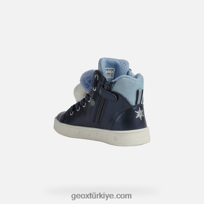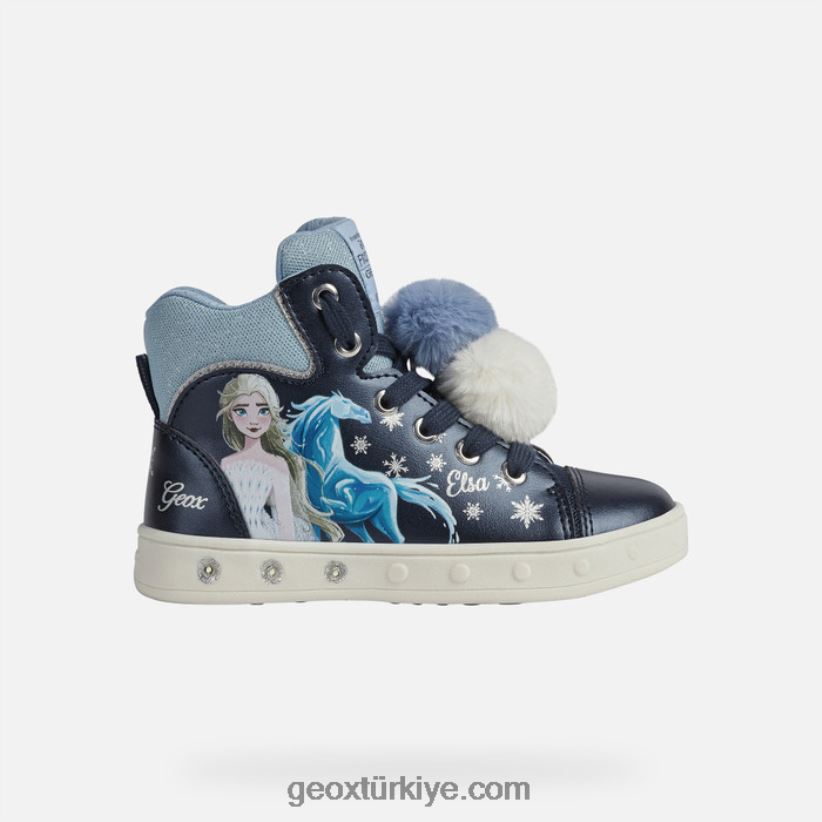 Kız çocukları için dahili ışıklı, rahat, nefes alabilen orta kesim spor ayakkabı. muhteşem disney süslemeleriyle süslenmiş orta kesim skylin spor ayakkabı, lacivert ve açık mavi renk grubunda sedefli deri efektli bir malzemeden yapılmış sayaya ve yanlarda elsa ve atının sihirli baskılı detaylarına sahiptir. Kürk efektli ponponlar ve ışıltılı bir süslemeyle tamamlanan bu ayakkabı, ayakları üstün rahatlık ve üst düzeyde rahatlık ile şımartmak için tasarlandı.