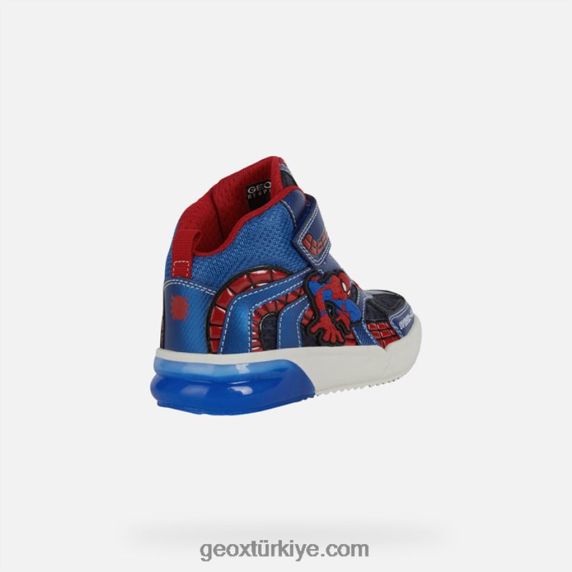 junior'un geox ve marvel ortaklığı sayesinde oluşturulan, günlük, nefes alabilen orta kesim spor ayakkabısı. Üst kısımdaki örümcek adam çizimi, ünlü kült figürün karakteristik özelliği olan kırmızı ve koyu mavi renk grubuna sahiptir. Kumaştan ve baskılı deri efektli malzemeden üretilen bu ayakkabı, şeffaf dış tabana yerleştirilmiş yanıp sönen ışıklara sahiptir ve çocuklar, ünlü süper kahramanları eşliğinde saatlerce eğlenceli yürüyüşler yapacak.nefes alabilirliközellikler