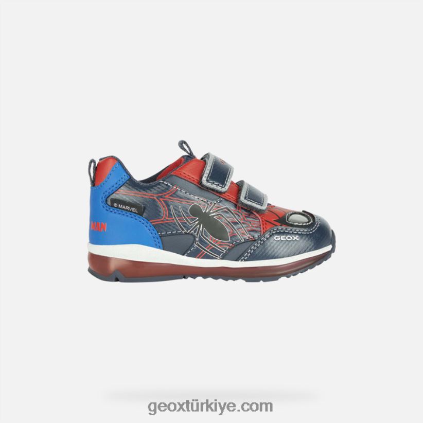 genç örümcek adam hayranları düşünülerek tasarlanmış, kolay ayak girişi olan, nefes alabilen erkek çocuk spor ayakkabısı. Hareketli bir lacivert ve kırmızı renk grubunda işlenen todo'nun bu versiyonu, geox ve marvel arasındaki özel ortaklığın bir ürünüdür. saya, baskılı ve düz deri efektli malzemenin karışımından yapılmıştır ve şeffaf ışıklı taban, her adımda daha fazla eğlence sunar.