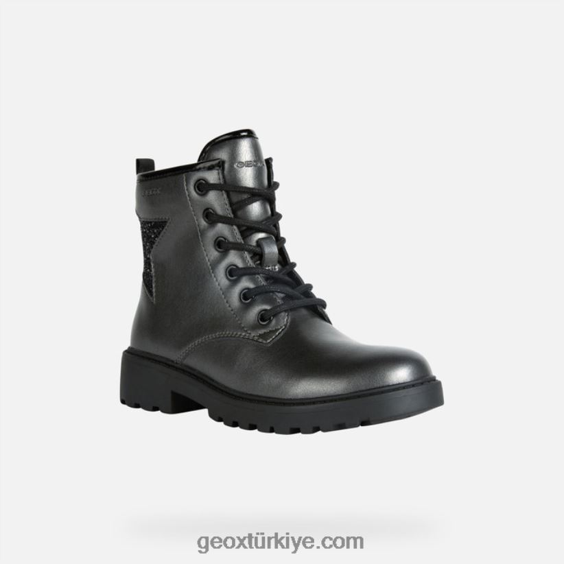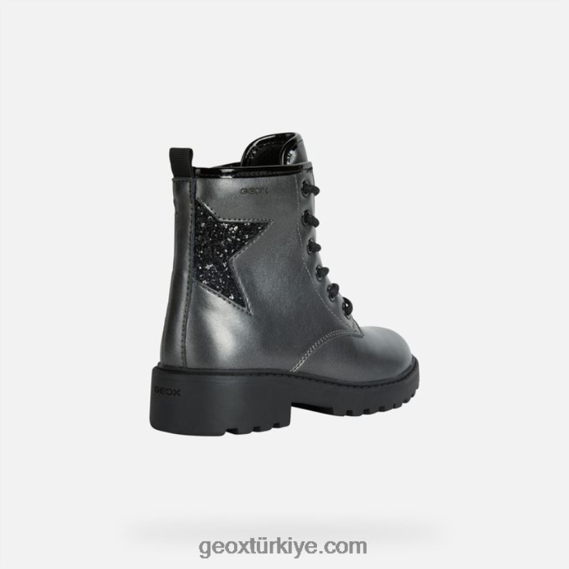 rahat, nefes alabilen bilekte kız çocuğu botu, kadınsı ayrıntılar askeri stil estetiğiyle dengeleniyor. Sedefli deri efektli bir malzeme ve arkasında modaya uygun kontrast oluşturan ışıltılı bir yıldız bulunan kumaştan üretilen bu koyu gri ve siyah casey versiyonu, kentsel şıklığı yansıtıyor. ordudan ilham alan tasarımıyla her kıyafete kolayca uyum sağlar.