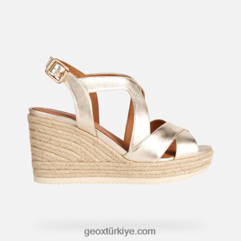 yüksek kama üzerine oturan, şehir stili ve tatil kıyafetleri düşünülerek tasarlanmış, kadınlar için rahat, hafif sandalet. Şık bir açık altın paletle işlenen bu versiyon, ikonik bir espadril tarzında örgülü bir tabanın üzerinde duran metalik deri bir sayaya sahiptir. ponza, feminen bir estetiğe sahip, rahat ama zarif bir ayakkabıdır ve yaz mevsiminde giyilen kıyafetlerin en iyisini ortaya çıkaracaktır.