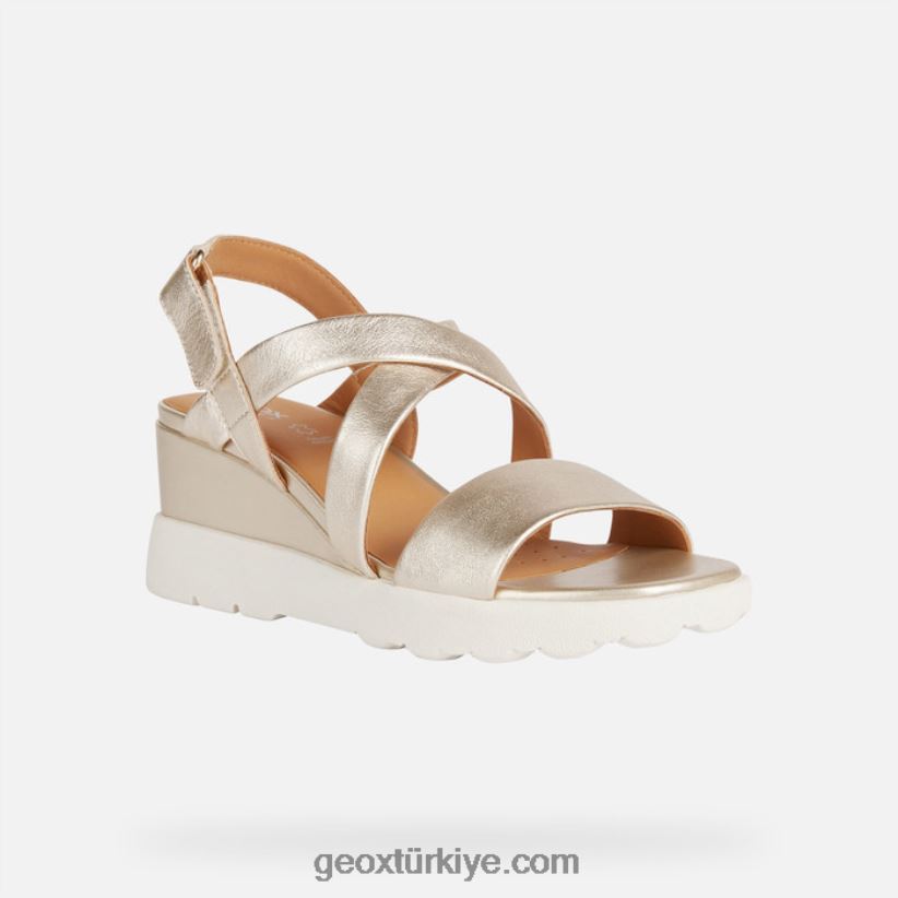 orta yükseklikte bir takoz üzerine yerleştirilmiş, kadınsı çekicilik ve şehir şıklığıyla dolu, kadınlar için çağdaş görünümlü hafif sandalet. Bu muhteşem açık altın versiyonu, güzel çapraz askılı metalik deri bir sayaya sahiptir. yastıklamalı bir dış taban üzerinde duruyor, spherica ec6, sıcak hava görünümüne kişilik etkisi ile enerji verirken en üst düzeyde rahatlık, denge ve destek sunar.