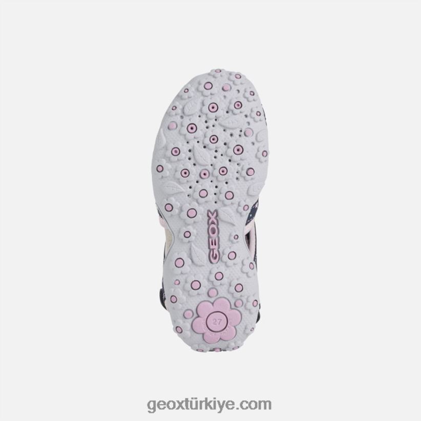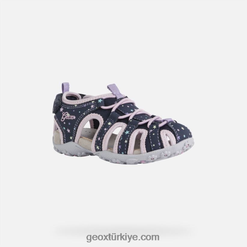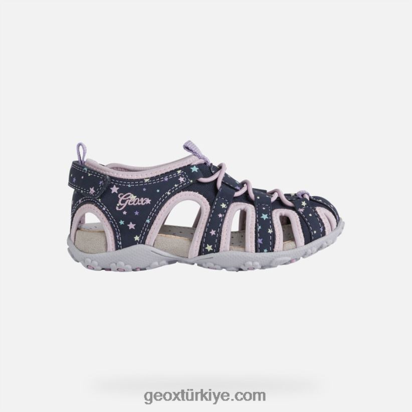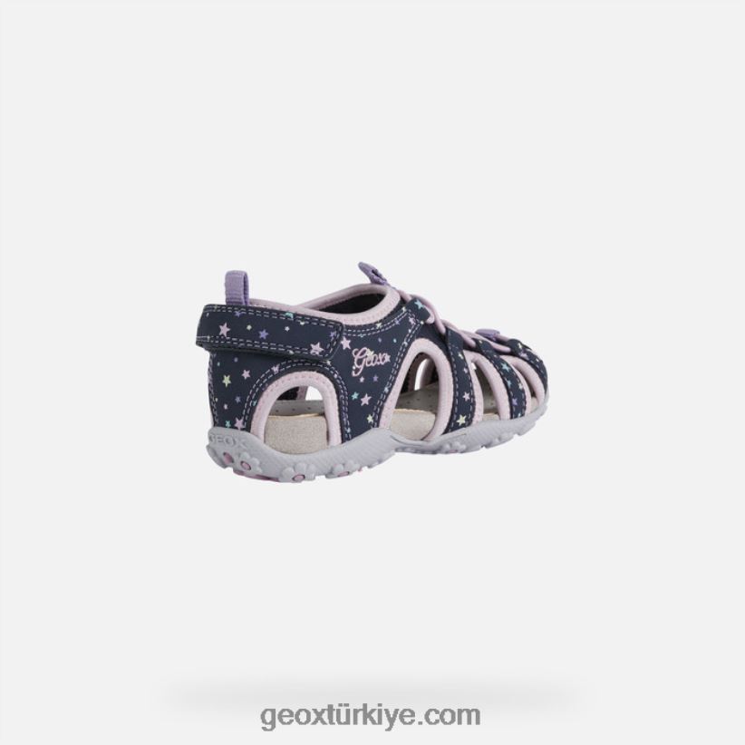 yüksek düzeyde koruma sunan, feminen görünümlü, burnu kapalı kız çocuğu sandaleti. Üstün düzeyde işlevsellik ve kadınsı romantik bir estetik sunan, nefes alabilen roxanne sandalet, küçük kızların ihtiyaçları düşünülerek tasarlandı. rahat ve giyilmesi kolay olan bu model, likradan yapılmış çekici bir sayaya ve minik yıldızlarla dolu lacivert-pembe deri görünümlü bir malzemeye sahiptir.