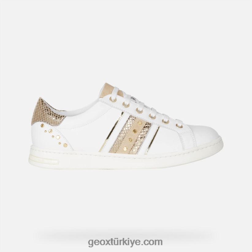 nefes alabilen rahat tasarıma sahip, düşük kesimli, çağdaş görünümlü, şık kadın spor ayakkabısı. altın rengi piton efektli parlak deri ekler ile süslenmiş beyaz nappa sayası ile jaysen, ikonik tenis spor ayakkabısının çağdaş bir yorumudur ve şık dekoratif çivilere sahiptir - bu, sizi stil setinin önünde tutacak tek bir ayakkabıdır .nefes alabilirlikhafifliközellikleri