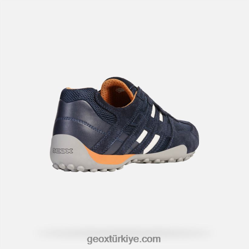 İkonik düzeyde konfor ve şıklık sunan slip-on erkek spor ayakkabısı. Aktif coşku ve çağdaş çekicilik arasında mükemmel bir denge kuran slip-on yılan spor ayakkabı, yoğun günlük rutinlere uygun, nefes alabilen, rahat ve olağanüstü çok yönlü bir ayakkabı parçasıdır. Süet deri ve ağdan, lacivert bir palette ve kontrast oluşturan turuncu ayrıntılarla üretilen bu versiyon, en rahat görünüme anında stil katmanın en mükemmel yoludur.klasik geox kauçuk taban, özel bir patent. delikli taban ile dirençli, nefes alabilen ve su geçirmez membran kombinasyonu, doğal sıcaklık düzenlemesine izin vererek ayakkabının içinde ayakları gün boyu kuru ve rahat tutan mükemmel bir mikro iklim yaratır.