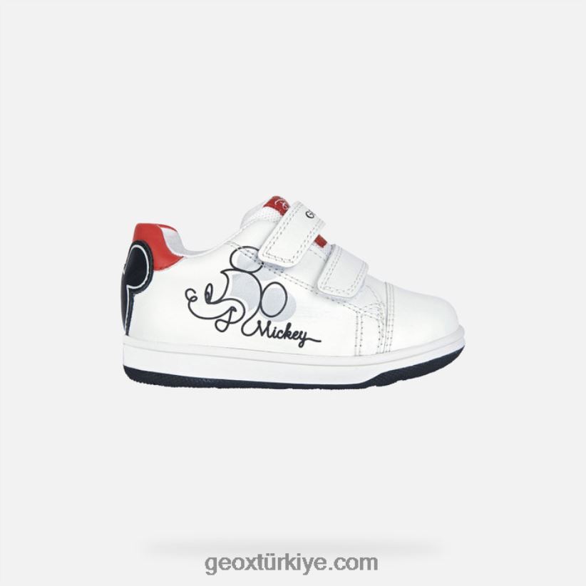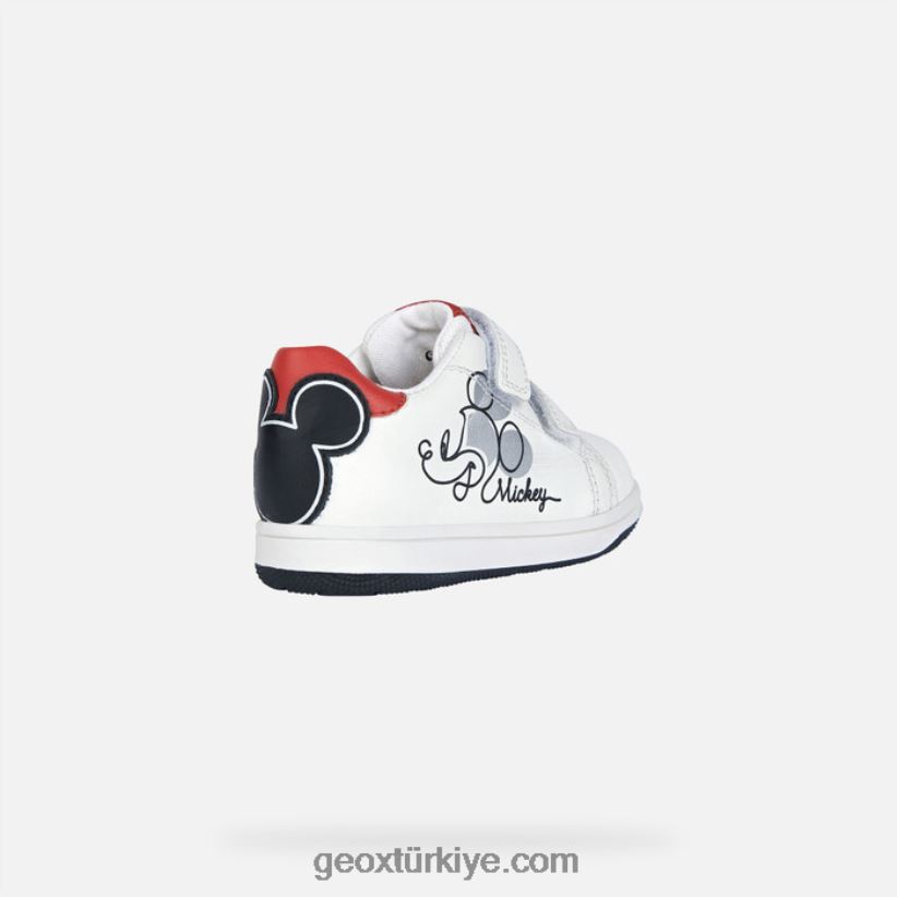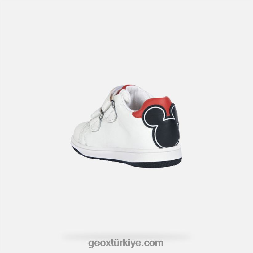 Eğlenceli bir dokunuşla rahat günlük giyim için bebekler için yumuşak, nefes alabilen spor ayakkabı. kırmızı ve siyah detaylı beyaz saya ayrıca bir yan baskıya ve topukta mickey mouse'u tasvir eden bir süslemeye sahiptir. geox ve disney arasındaki ortaklığın bir ürünü olan new flick, esnek nappa ve deri görünümlü malzemeden yapılmış, ayarlanabilir çift cırt cırtlı sportif bir ayakkabıdır.